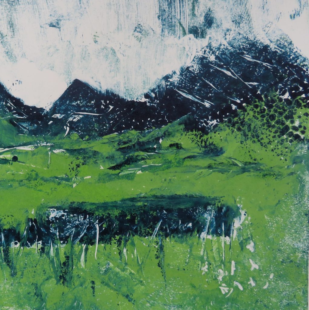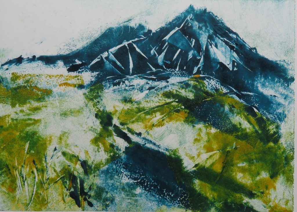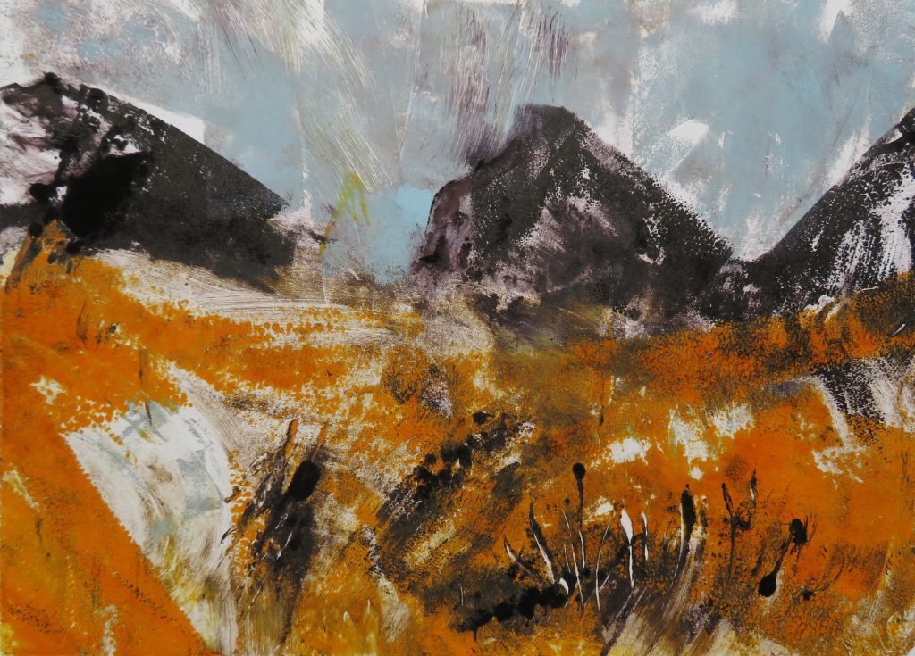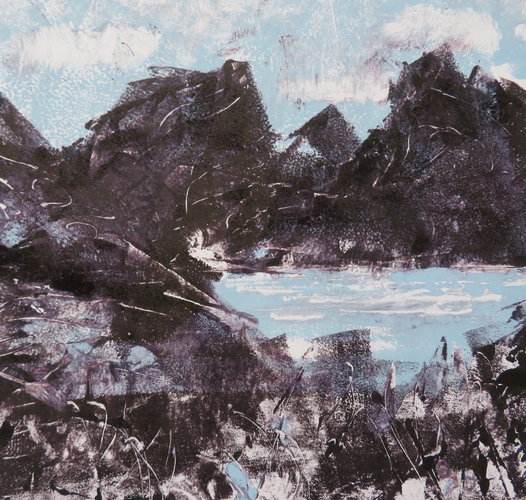 I’m a painter and printmaker who lives in the Scottish Highlands. Most of my work is landscape-inspired. I sketch outdoors in all seasons – hillscapes and seascapes – and bring sketches back to my studio to work into finished drawings and paintings. My paintings are mostly mixed media/acrylic and I make various types of prints on my studio printing press – linocuts, collagraphs, etchings, aquatints and photopolymer prints.