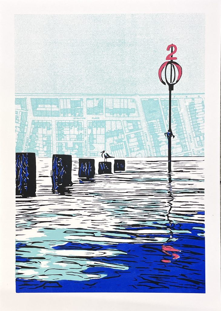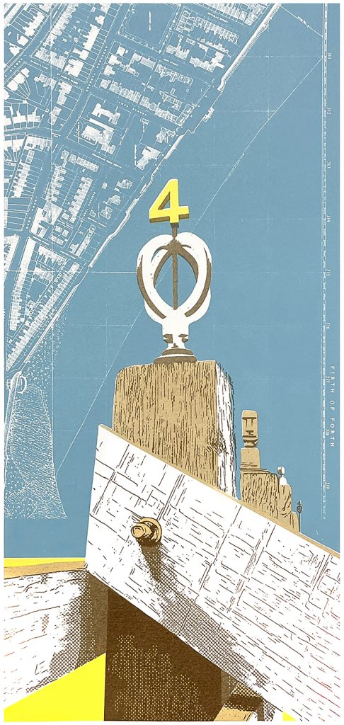 The inspiration for my screen prints often comes from my photographs. I search for an unusual angle on familiar landmarks and then strip it back to its strongest components. I then screen print using bold colour combinations and sections of vintage maps which provide locality to the subjects, and tie in the area’s history.