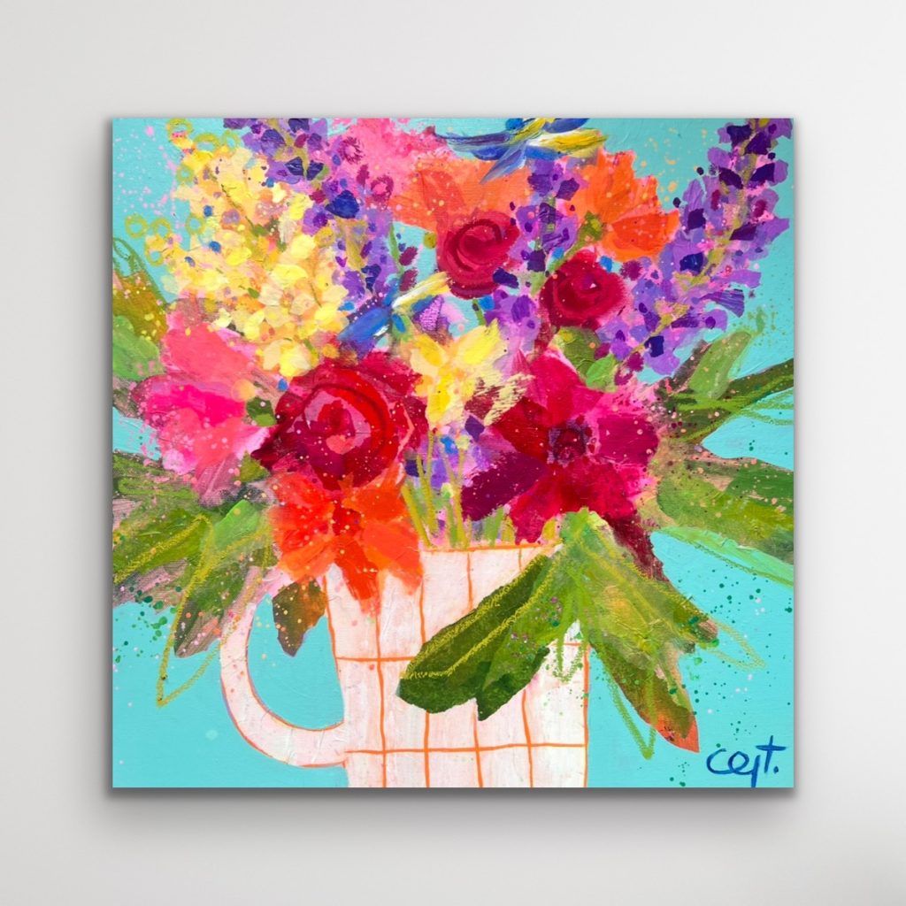 “I have a very emotional connection to the landscape & light around the Pentland hills near to where I live. My aim is to convey those feelings I have in a place by playing with bold colours, layers & texture. I start spontaneously at first, never having an end goal in mind, I work from my memories & feelings to try & offer a sense of place. I begin creating drips & energetic brush strokes which I then build upon through glazes, which can be sanded back & built upon again with thicker paint using my palette knife. Each new layer adds depth, but also shows glimpses of what came before underneath. I like to play with unexpected colours, luminous oranges & pinks & gold leaf to get a real sense of light within a piece”