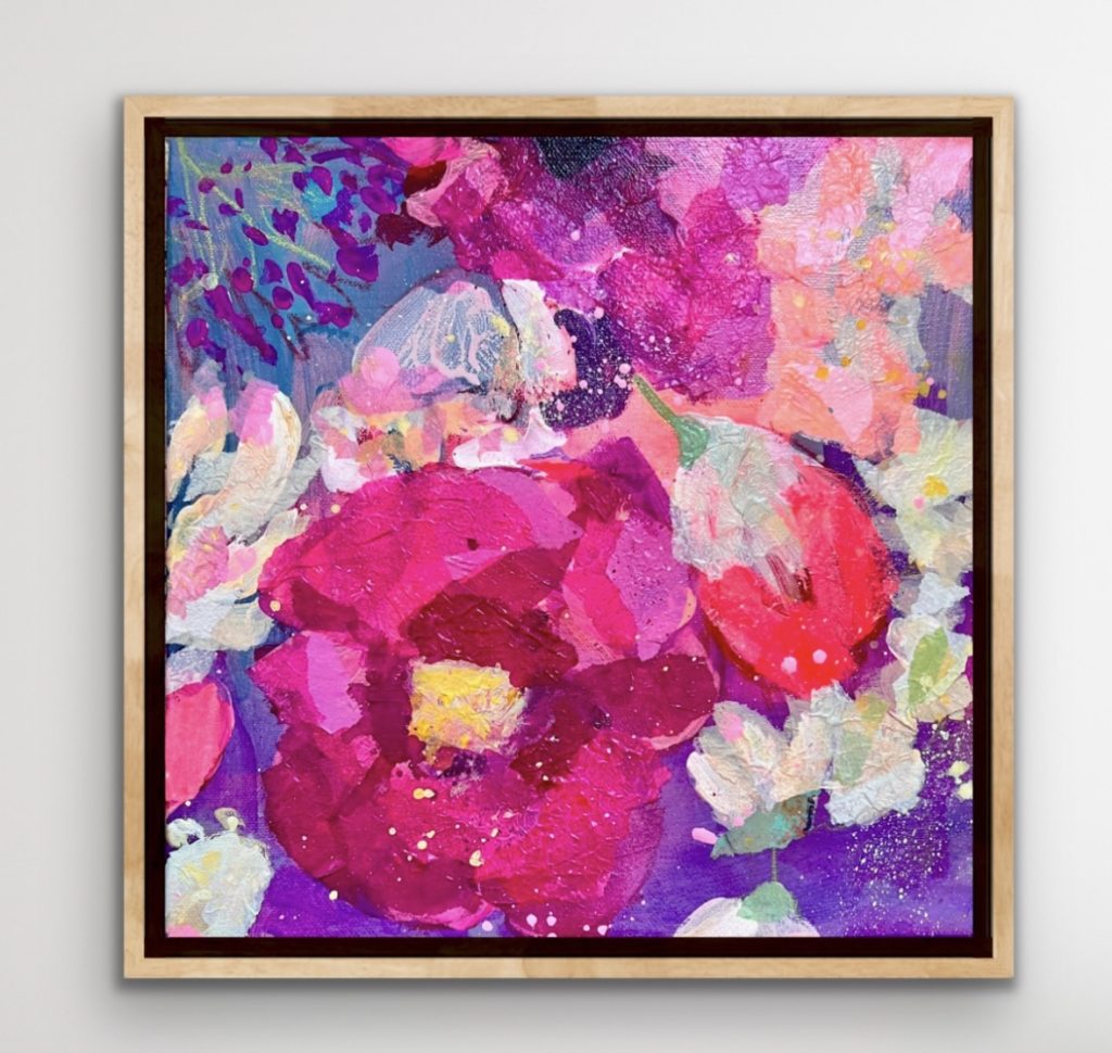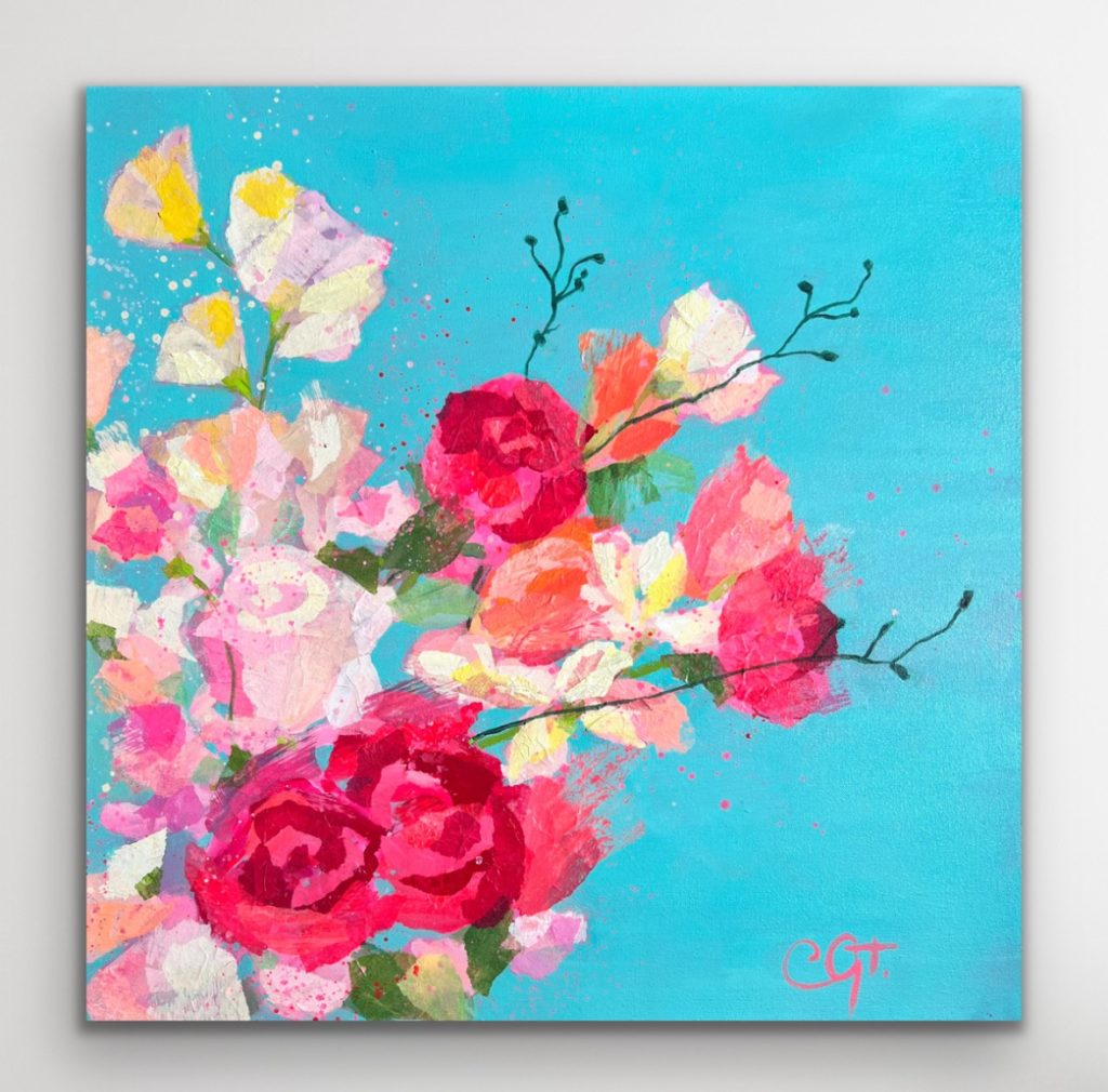 “I have a very emotional connection to the landscape & light around the Pentland hills near to where I live. My aim is to convey those feelings I have in a place by playing with bold colours, layers & texture. I start spontaneously at first, never having an end goal in mind, I work from my memories & feelings to try & offer a sense of place. I begin creating drips & energetic brush strokes which I then build upon through glazes, which can be sanded back & built upon again with thicker paint using my palette knife. Each new layer adds depth, but also shows glimpses of what came before underneath. I like to play with unexpected colours, luminous oranges & pinks & gold leaf to get a real sense of light within a piece”