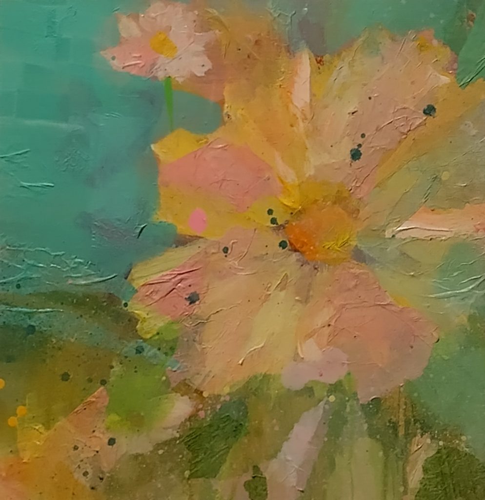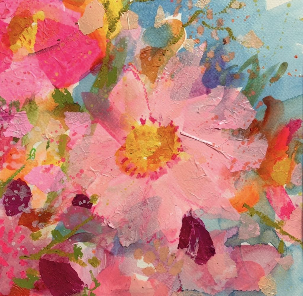 Claire Gillie-Thompson is a contemporary artist specialising in floral collage painting. Her painting practice has evolved recently to explore floral designs using a method of tissue paper collage. Working in a bold and expressive manner she builds layers of paint & coloured collage paper which have been personally hand prepared. Using the paper she tears & manipulate shapes to create the idea of petals & brush strokes. Adding more paint and oil pastels on top of the collage creates bright, raw spontaneous floral artworks all unique & striking in their nature.