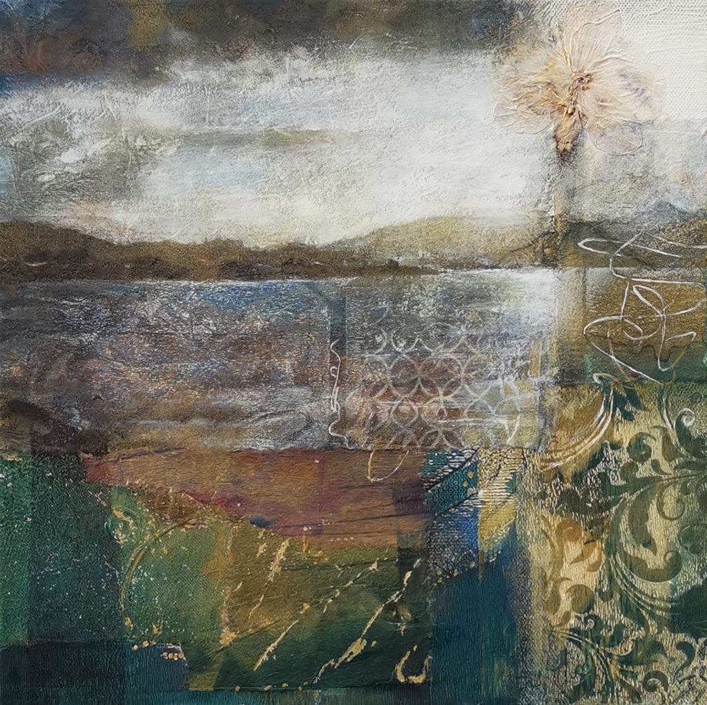 ‘I use mixed media techniques to evoke a memory of time and place in my work. The faded grandeur of the peeling facades of Venetian palaces, revealing their echoing stories layer by layer, a glimpse into another life and time. Ornate architectural details from Classical, Byzantine and Gothic-Renaissance styles sit alongside the more natural forms of shells, plants and birds. Fragments from handwritten letters, poetry and vintage wallpaper are incorporated into the collaged backgrounds of my paintings, creating surface textures which suggest the patina of age and which hint at the ethereal.’