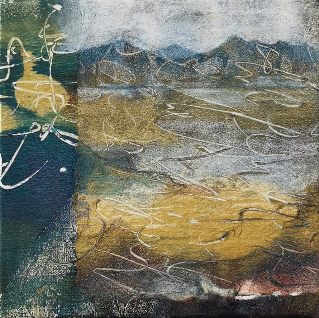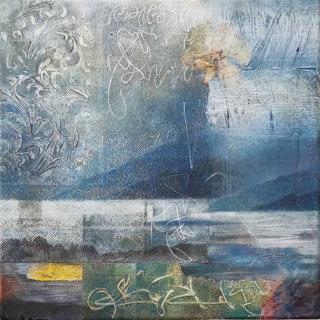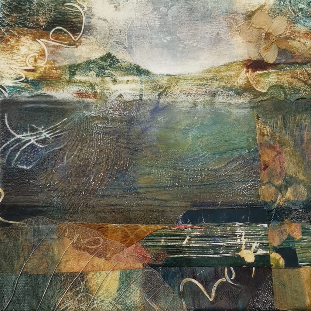 ‘I use mixed media techniques to evoke a memory of time and place in my work. The faded grandeur of the peeling facades of Venetian palaces, revealing their echoing stories layer by layer, a glimpse into another life and time. Ornate architectural details from Classical, Byzantine and Gothic-Renaissance styles sit alongside the more natural forms of shells, plants and birds. Fragments from handwritten letters, poetry and vintage wallpaper are incorporated into the collaged backgrounds of my paintings, creating surface textures which suggest the patina of age and which hint at the ethereal.’