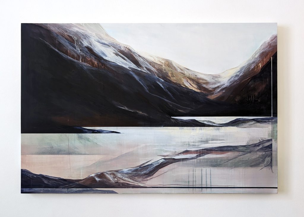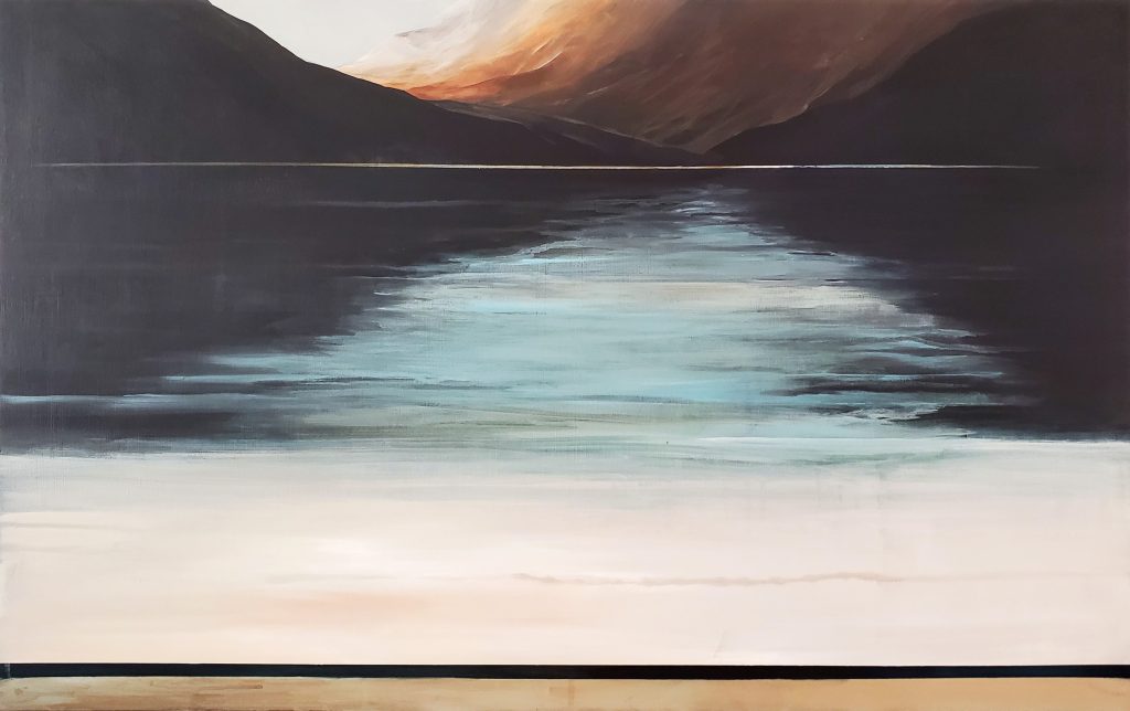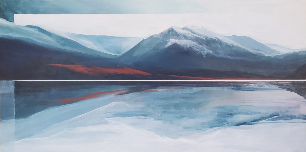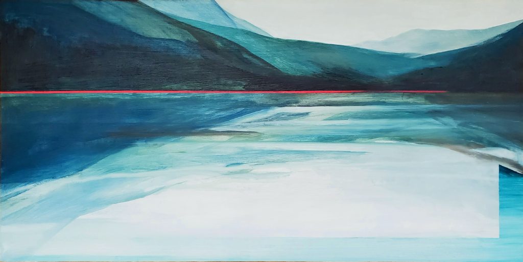 By layering the image, Connie creates depth than enables the viewer to be absorbed through focussed segments of interest, along with more peripheral hazy areas. Connie is drawn to the edge of the land by her love of outdoor swimming. The watery surfaces play, reflect and refract the formal segments of land, water and sky, and transform the work into a simplified study of line, shape and colour. Connie uses translucent layers of chalky gesso, along with glossy inks and acrylics to paint, rub and scrape, mimicking the contrasting textures of the landscape.
