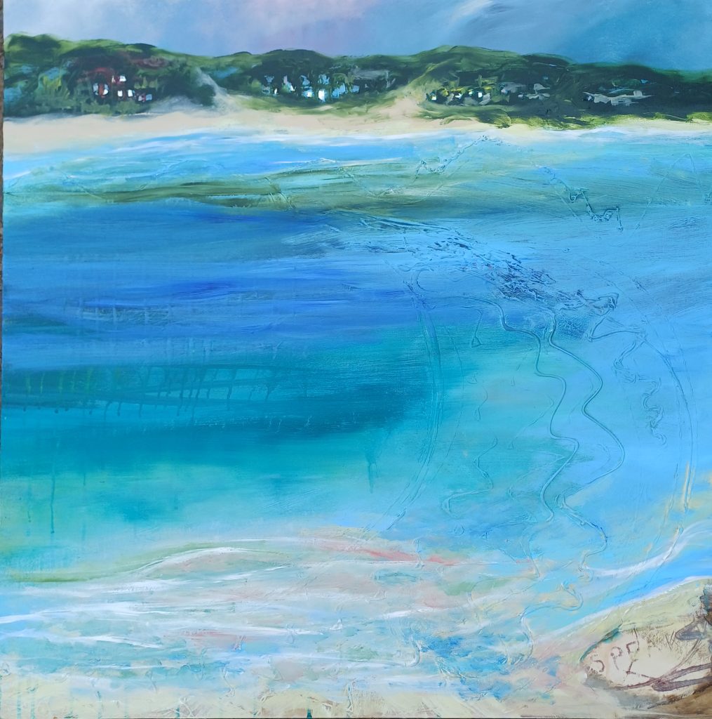 Making repeated journeys; walking; running; climbing; cycling; I note the small changes brought to a familiar place. The sense of place drives me to connect with others with the same feeling of belonging or displacement ; the humanity which connects us all, different but the same. We all see the same sky. I apply pattern and texture in the under painting, adding elements of texture in layers. I use found objects and personal scraps linking part of my own story to the picture, in the same way that stories and songs are handed on through generations. I use paint peeled from yesterday’s palette to prepare the next support, so that each painting is physically connected to the painting after (and protects the environment!)