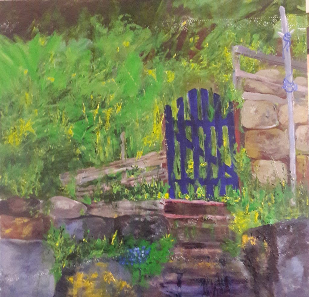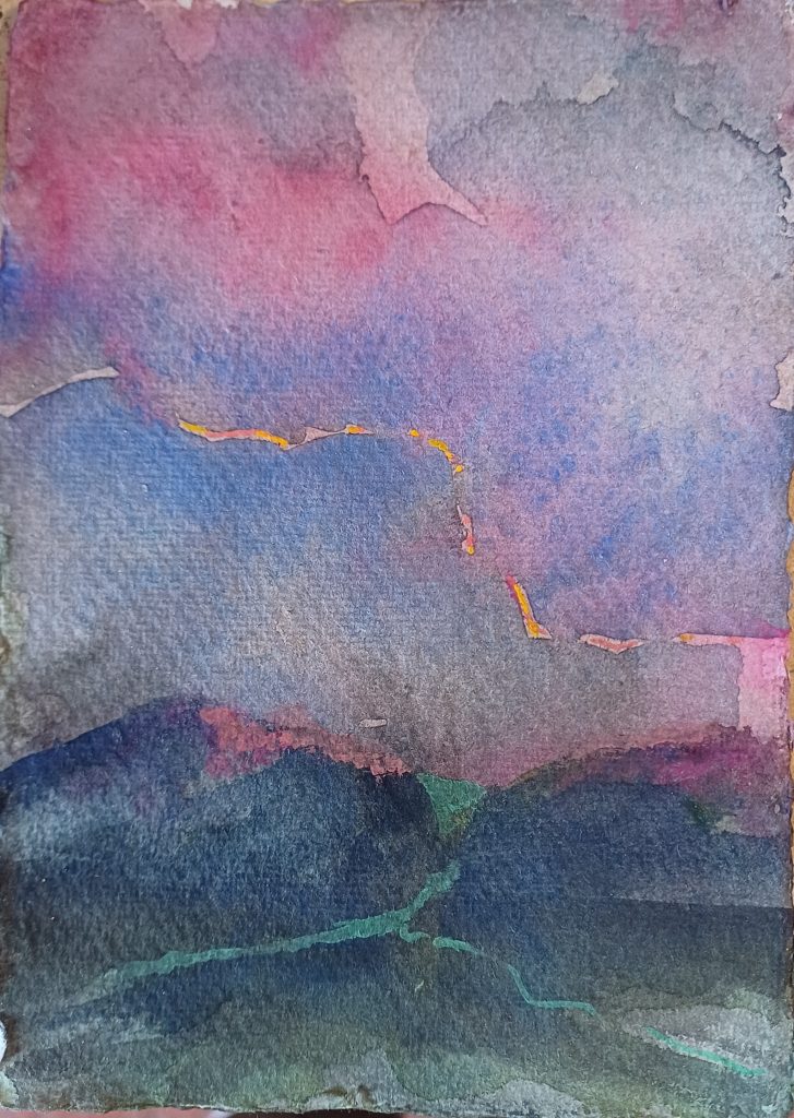 Making repeated journeys; walking; running; climbing; cycling; I note the small changes brought to a familiar place. The sense of place drives me to connect with others with the same feeling of belonging or displacement ; the humanity which connects us all, different but the same. We all see the same sky. I apply pattern and texture in the under painting, adding elements of texture in layers. I use found objects and personal scraps linking part of my own story to the picture, in the same way that stories and songs are handed on through generations. I use paint peeled from yesterday’s palette to prepare the next support, so that each painting is physically connected to the painting after (and protects the environment!)