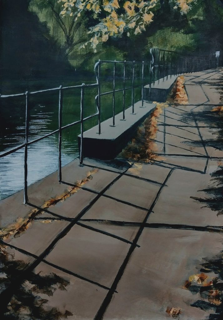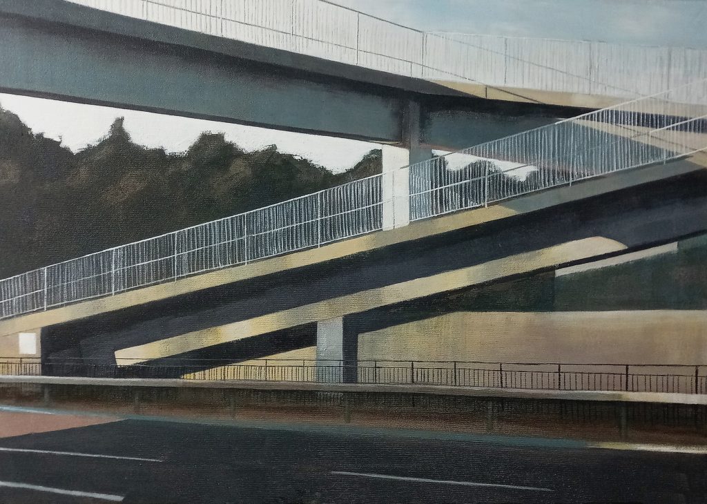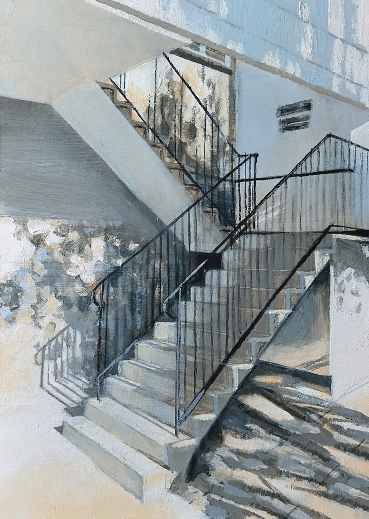 Painting is the mainstay of her practice with drawing a fundamental, underpinning aspect. Lindsey’s paintings examine built environments seeking simple, overlooked observations with a fascination and intrigue of the everyday. Her work has a sense of narrative and an atmosphere of calm which draws the viewer in. She explores the rhythm of light and shade, often on the seemingly ordinary.