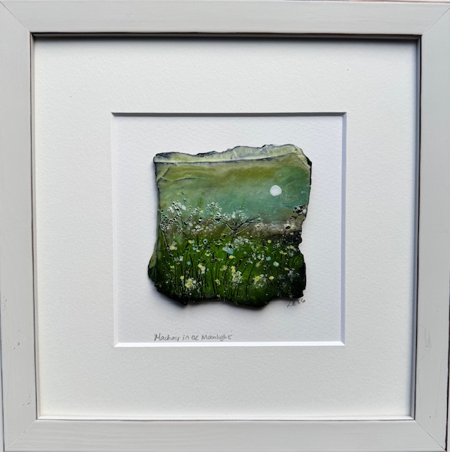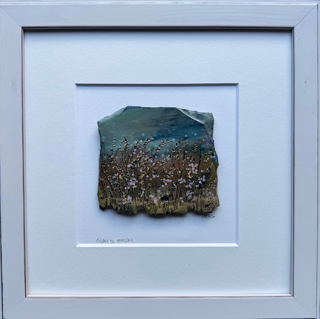 Ten years ago I began working with Slate and Wax. The combination is so exhilarating as it creates a wonderful tapestry of colours due to the mixing and heating process. The Slate, in its raw organic state, lends itself to the Scottish seascapes and landscapes which I try to recreate.