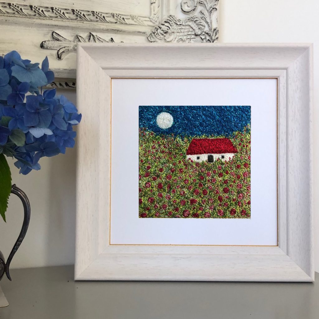 My stitched work is made firstly by painting artists canvas, this is important to me, it’s not traced or printed on a computer but a freehand drawing and painting, original in both idea and process.I then layering with millions of tiny stitches, using only straight stitch and just the needle, guided by my hand on my domestic sewing machine (this of course with a profusion of richly coloured thread). The background painting can be glimpsed at times through the thread, but it’s totality will remain hidden, a secret landscape. Simplicity is at the very heart of my work.