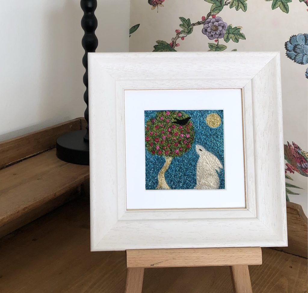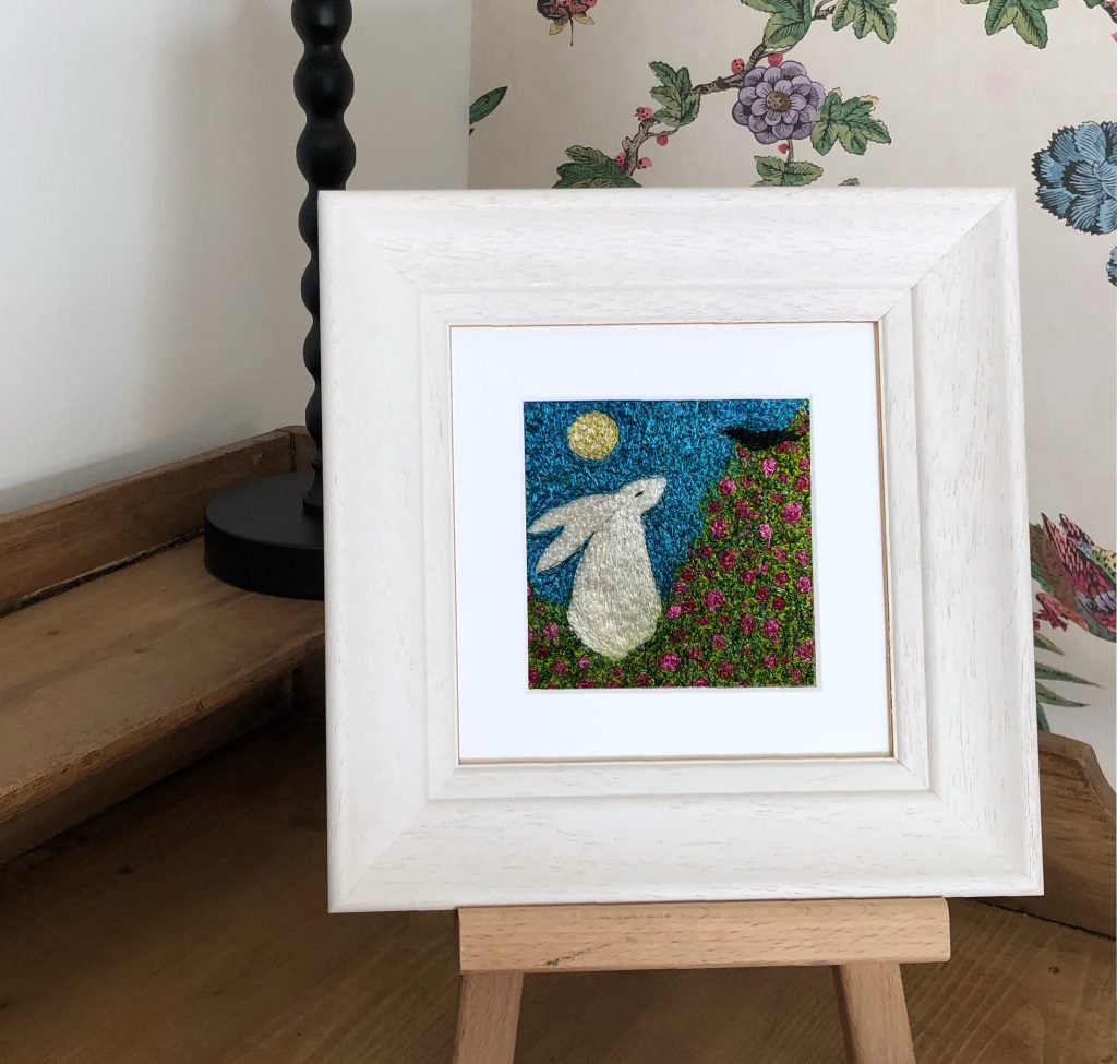 Having lost my hearing as a result of a viral infection I have had to adjust to many challenges and changes. The white hare featured in much of my embroidered work is for me an analogy for the ability to change, adapt, transform and represents the resilience of the survival instinct.