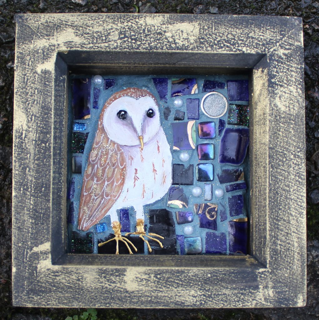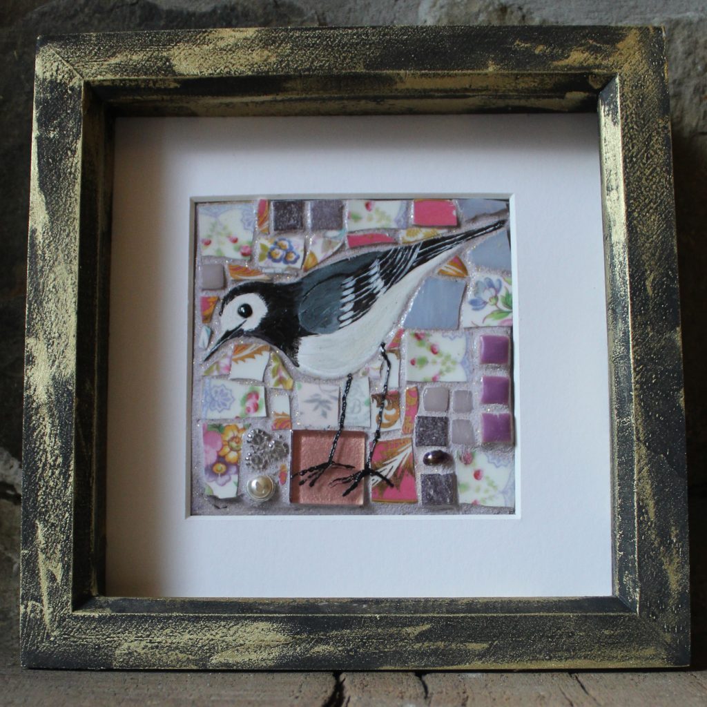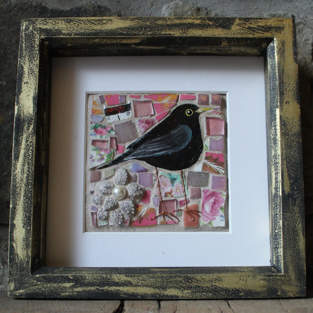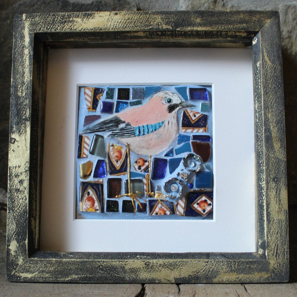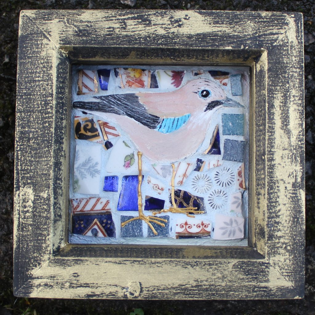 Her collage style developed from textile design methods. She often used collage as a medium for her woven design ideas. The collage process soon became the main focus and later her style began to include upcycled materials. “I love creating something beautiful from something which has lost its purpose. I use anything that will stick” Even sweet wrappers find their way into her work. Her urge to create magic from lost items her into the world of mosaics finding she could combine lovely old broken vintage china with clay to make little picture treasures. Birds are her main inspiration as she spends many hours watching and feeding the birds in her remote woodland garden “They are so fascinating and each one seems to have its own personality, perfect for my quirky mosaics”.
