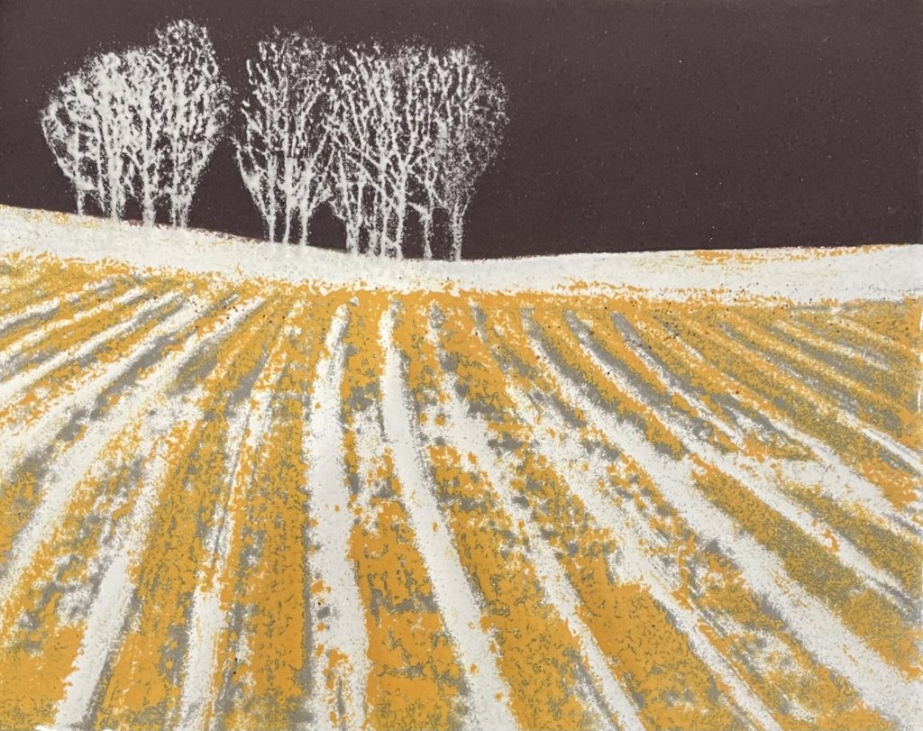 Shelagh’s enamel pictures consist of many layers of glass powder, sifted or painted until the colours and textures reflect the shifting patterns of the fields and trees in the Aberdeen farmland which she often visits.