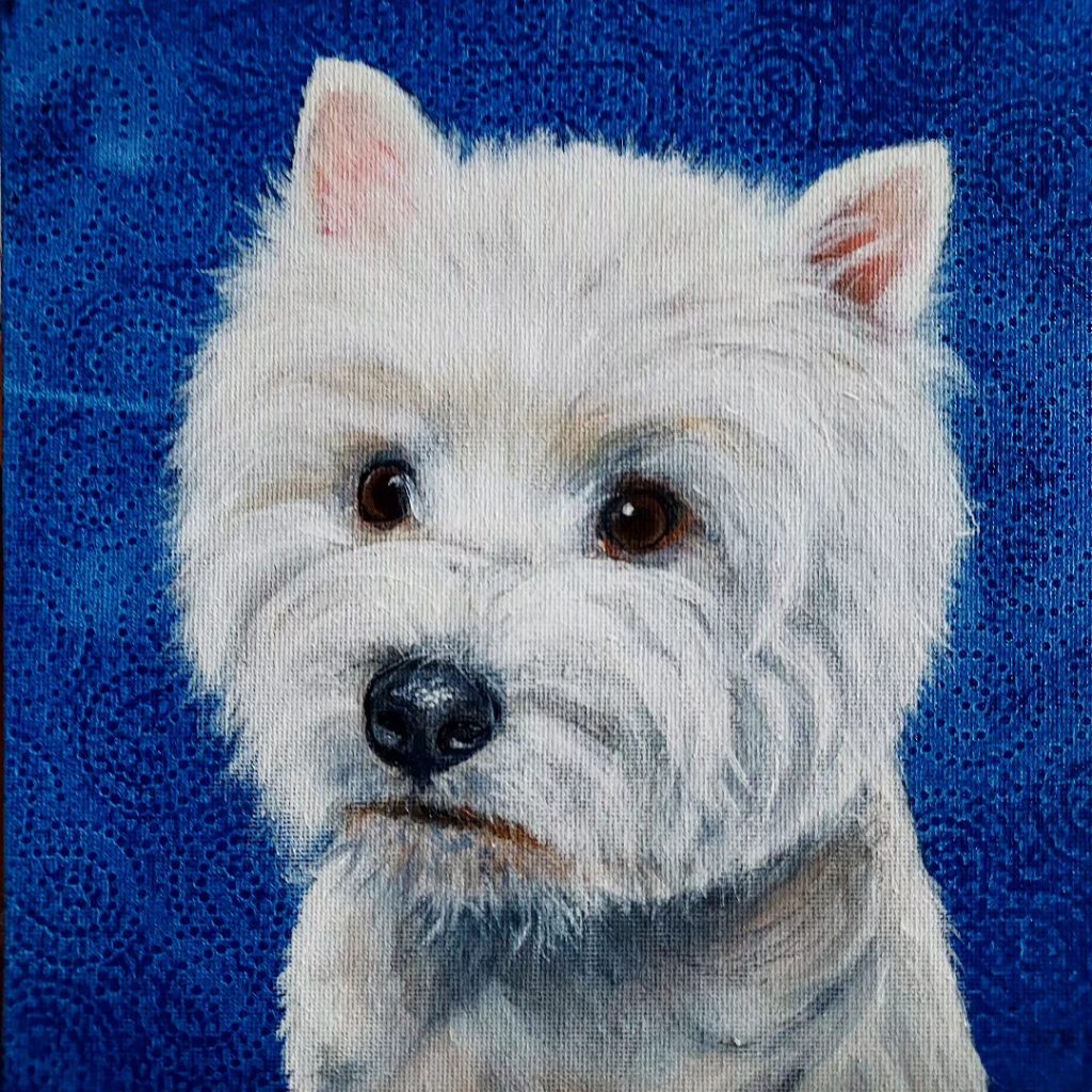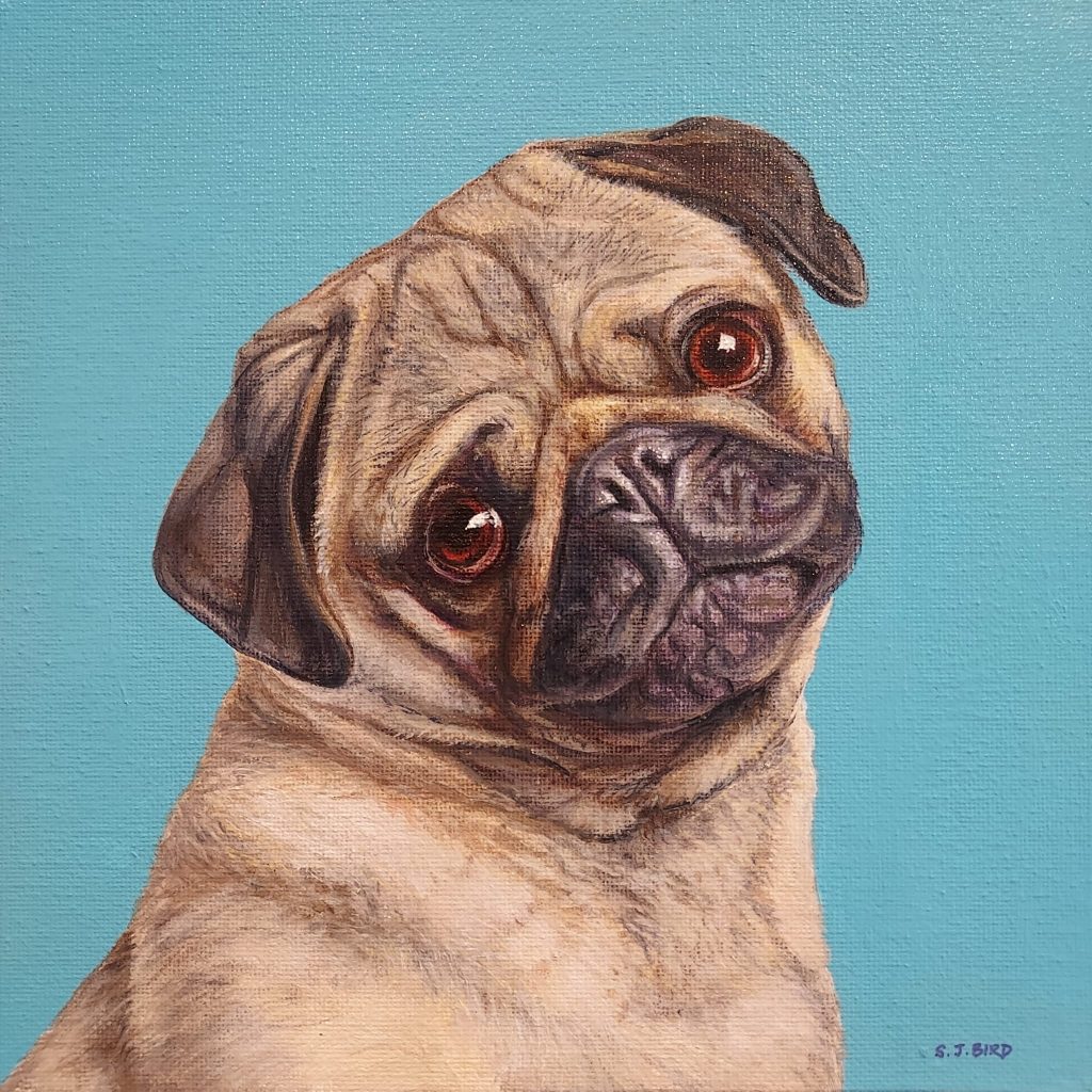 intimate, mixed media paintings of these and other animals. Recently his work has included a series of “Dug-Shots” – characterful portraits of “Man’s Best Friend”. He is also fond of painting all sort of wildlife from the hot plains of Africa, to the dark forests of Scotland and the domestic back garden.